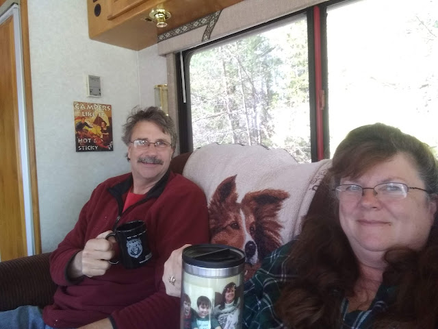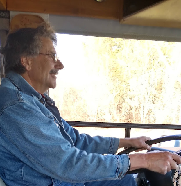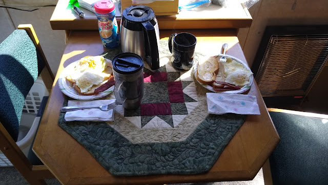 We went back in and Steve started cooking up a nice breakfast. We had brought along bacon, eggs and bread, along with our carafe of coffee. The sunshine streaming in was so pleasant. We were "camping" in our minds, even if we were only 10 miles from home. The motorhome smelled like rich bacon, fresh coffee and frying eggs and scrumptious toast. It don't get much better than that.