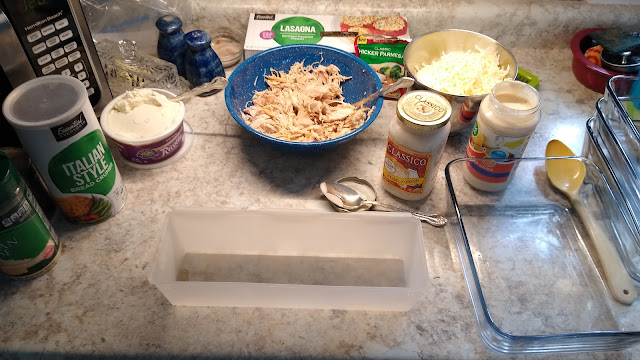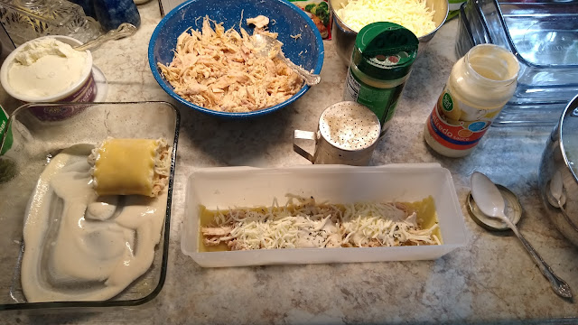 While the traditional italian tomato type sauce was simmering, I got out shredded chicken from the freezer, and some jars of alfredo sauce. This is my setup for making my special rolled up lasagna pans.