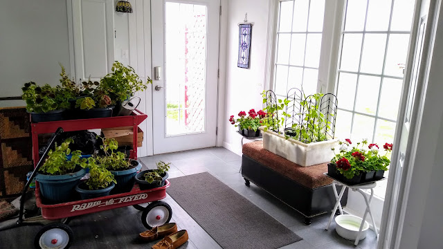 The weather reports were full of gloom and doom about freezing and frost and awful predictions of *S*N*O*W*!!! After spending all that money the day before at the greenhouse, I was not about to put my plants in danger by leaving them in the garage. Yup, into the She Shed they came! All of them. Safe and sound.