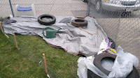 Because the weather report was awful, and she was worried about her little garden. They were out of town for the weekend. Awwwwww So it was Grandma and Grandpa to the rescue! We went over to the little daycare yard and covered the plants up for the night, and then uncovered them for the day, once things warmed up.