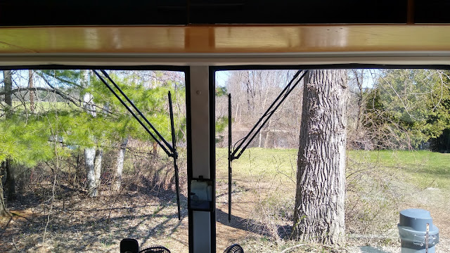 The view out the front windshield was pleasant. We could pretend we were somewhere wayyyy out in the woods, up north some place. Getting away and getting some relaxing camping for the weekend.