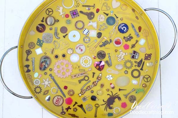 Now mix 8 ounces of resin according to the package directions in the 2 phase process. Mix one part resin and one part hardener and stir for 2 full minutes. Then pour the resin in the second mixing cup and use a new stick to stir the resin for another full minute. This mixing process is so important for the proper hardening of the resin.Then pour the mixed resin over the surface of the tray. The resin is self-leveling, so it will move around the tray and fill in gaps, holes and little places in the trinkets. So, just start with the 8 ounces of resin to give it the proper time needed to fill in gaps.