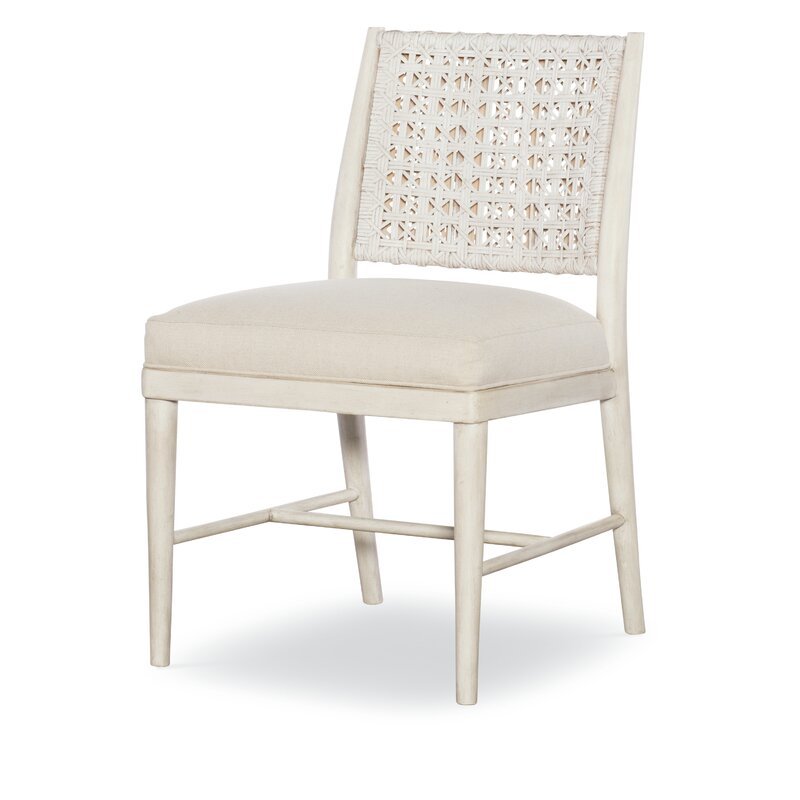 I really like these dining chairs as they are a woven rattan finish but they aren't too gold toned. The finish looks to be more of an off-white, so it would reflect the finish of the whiter kitchen cabinets. I'd reupholster the seats eventually in a fabric that would work with your Maritime cabinet color, some kind of pattern would be nice.