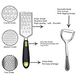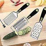 Combination set the set contains 4 graters with different apertures grater cleaning brush and a peelerthe coarsecut grater is suitable for cheese and the middlecut grater is suitable for vegetables such as zucchini The finecut grater can be used to make fruit meat This is also a good tool for making nutritious meals for children such as carrots potatoes watermelons etc There are more functions waiting for you to discover 1Grater kitchen tool 3pcs kitchen cheese grater is made of pp trp stainless steelvery safe and sharp wearresistant and durable it is an essential kitchen tool to save time easily chop cheese fruits vegetables ginger and garlic with a razor sharp stainless steel blade