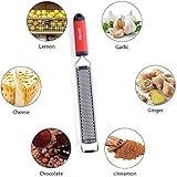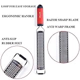 DflowerK - Lightweight and easier to grindyou can easy to hold zester with one hand while holding your food product in your other hand then use it to cheese lemon zest or grating chocolate over the top of cake or use it grate an entire onion directly into your pan dont require to dirty another dish Easy to usethe ergonomic handle provides you with a soft and comfortable touchits very comfortable and felt natural in your hand The slipresistant loop at the end of the cheese grater provide stability and flexibility when grated and protect your cutting board and counter tops