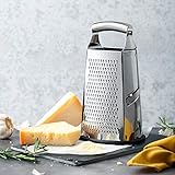 Amazon Basics - Dishwasher safe Coarsely grate cheese potatos carrots garlic and other hard foods Foodsafe stainless steel construction with sharp grating blade Handheld grater for creating coarsely shredded toppings and ingredients Nonslip softgrip handle for steady control and raised rubber feet for sanitary countertop placement